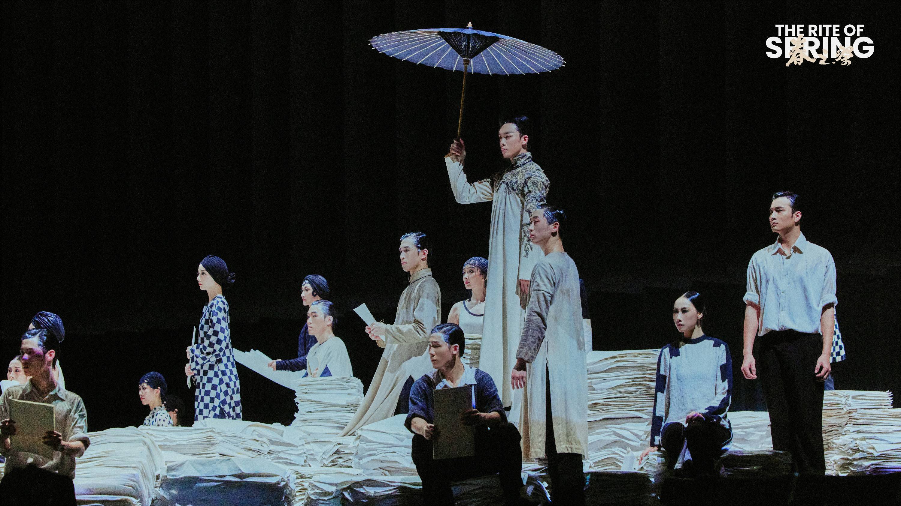 不同于以往《春之祭》作品对原始献祭主题的延续,导演李超将舞蹈剧场《春之祭》聚焦在远赴巴黎的中国青年艺术家群像,“更多观众关注到题材中的人性与真实情感体验,这恰好契合了我对那群艺术先驱的想象”。林风眠的中西融合之思、常书鸿的敦煌守护之志、徐悲鸿的艺术求索之路,化作舞台上油纸伞与折扇的轻摇、书简堆中的沉思、三角舞台转动时的漂泊意象,让“冲破网罗,闯出新路”成为贯穿始终的精神主线。当丰富的肢体语汇碰撞冷峻干净的光影,风格多变的音乐交织《再别康桥》的诗化独白,恰如观众所言“东方的底子很含蓄,却是西方的肢体表达”,这种东西方美学的奇妙平衡,正是李超所追求的“中国人有温度的方式”。