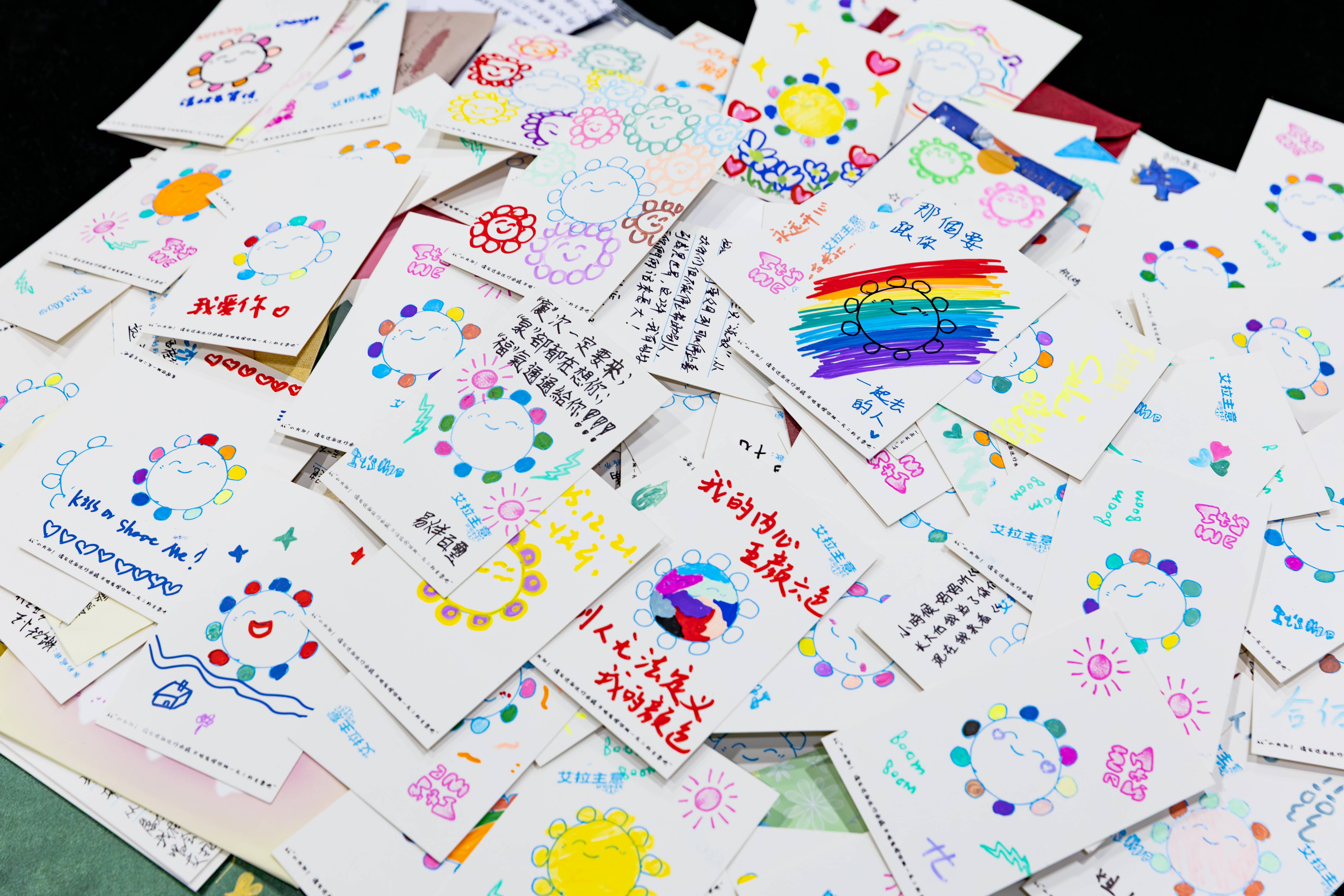 而对于没有被翻牌的现场歌迷,除了精心准备小太阳信箱之外,广州站特别推出了“小太阳明信片”,演出当日午后,场馆外的主题嘉年华区便已人员爆满,歌迷们在印有Ella亲绘“小太阳”图案的明信片上,一面进行个性化涂鸦创作,一面认真写下想对Ella诉说的心里话,