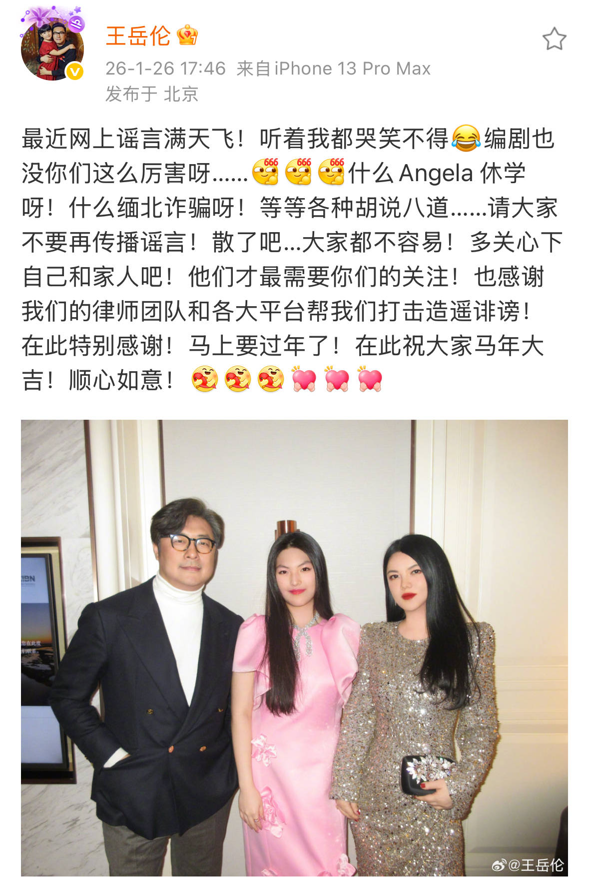 近日,网传关于李湘的一系列不实内容在网络上大肆传播,相关谣言引起广泛关注与讨论。对此,王岳伦通过微博公开回应,指出相关内容纯属谣言,呼吁网友停止传播,坚决维护家人的名誉。