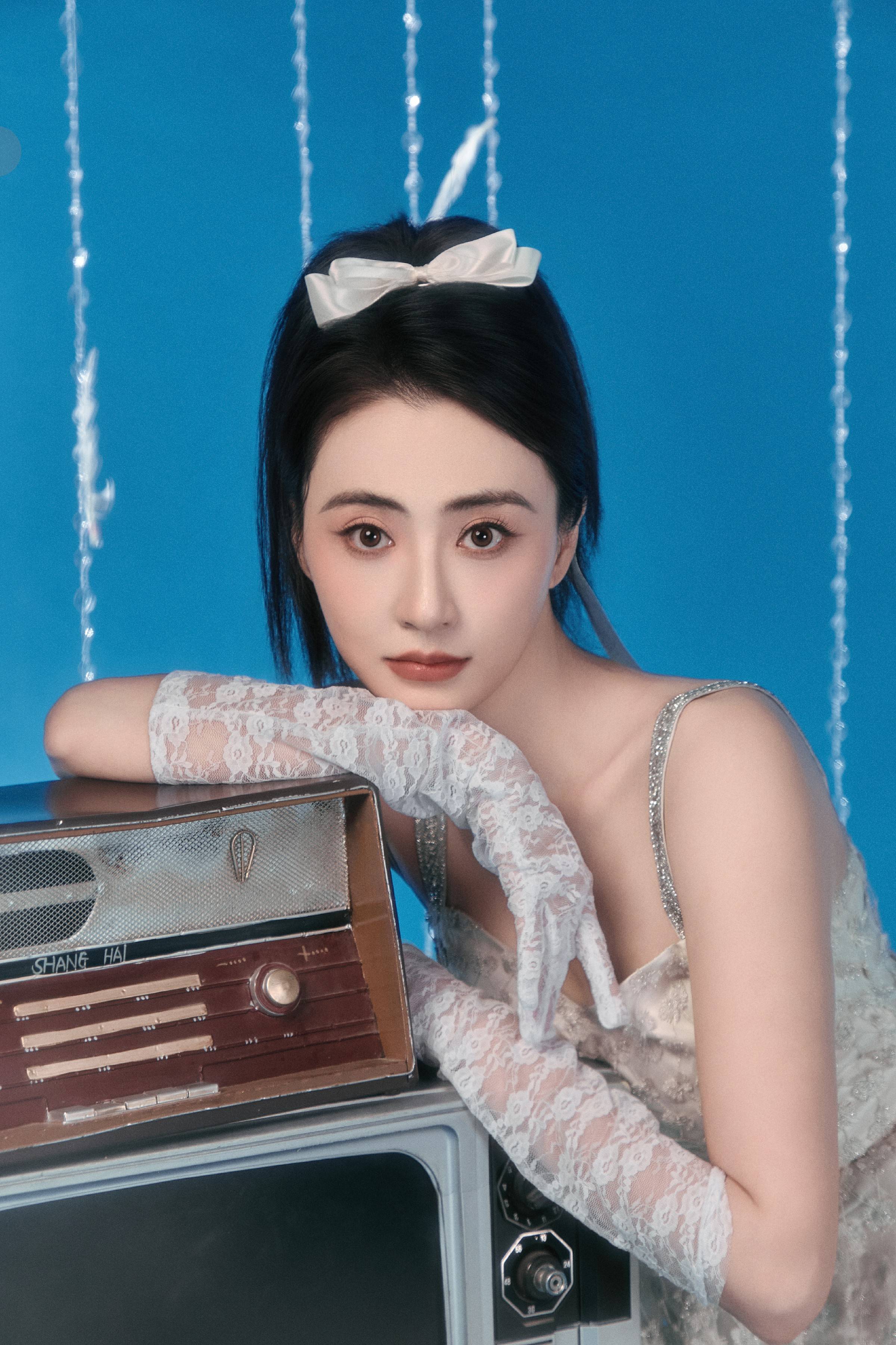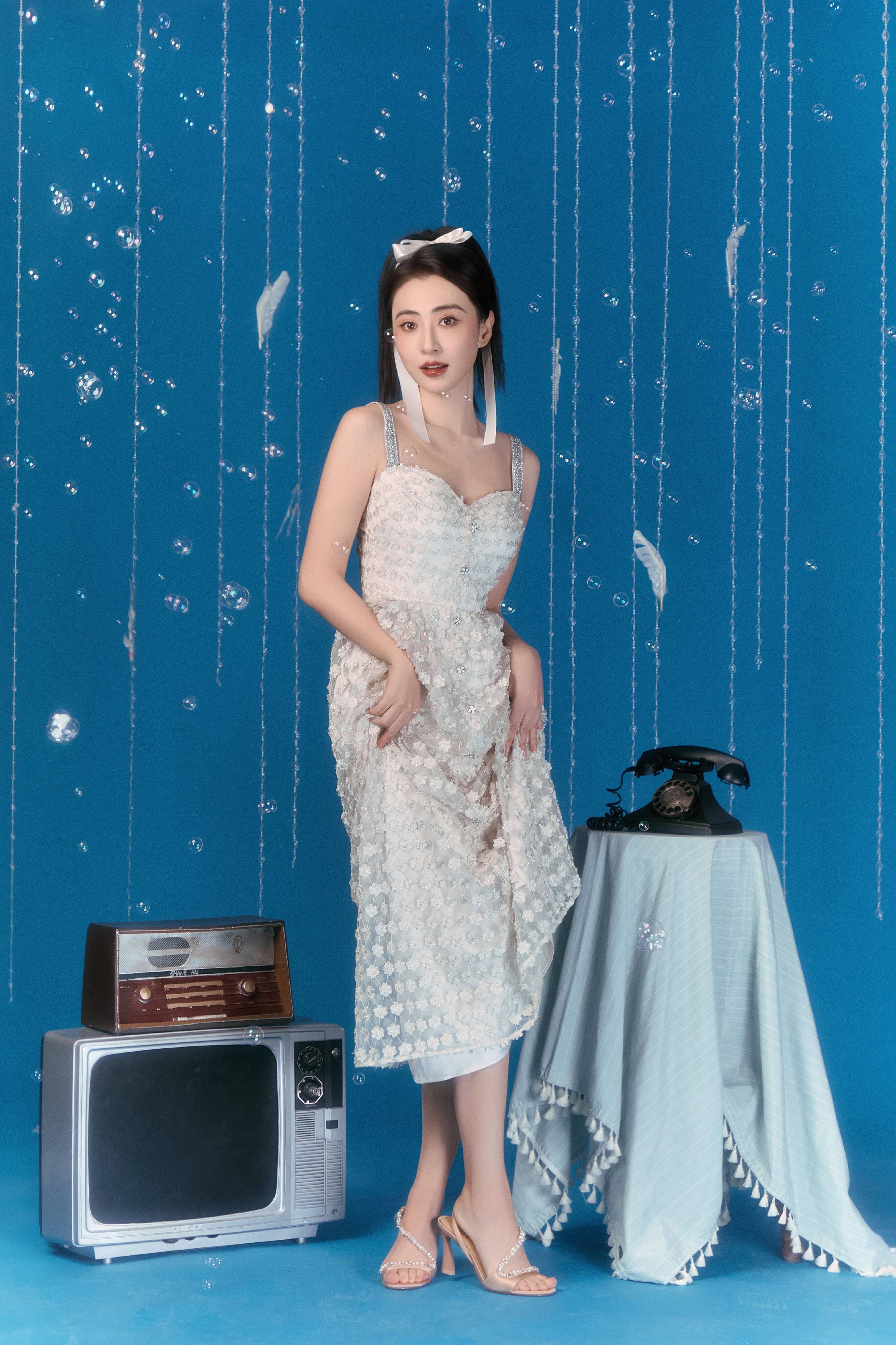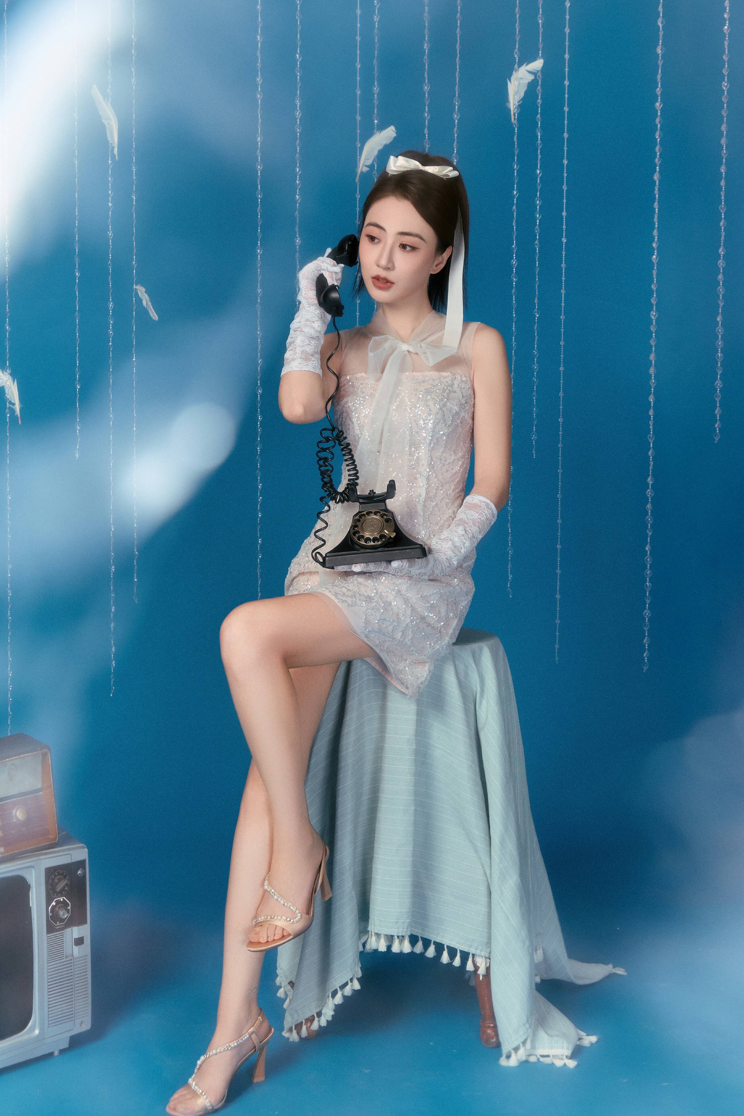 这组写真以高饱和度的克莱因蓝为背景,搭配复古收音机、老式电视机等道具,构建出一个怀旧氛围的梦境空间。镜头捕捉的不只是造型的精致,更是一种松弛自在的情绪表达。没有紧绷的姿态,只有松弛与自在,仿佛她正从旧时光里醒来,带着不被世俗惊扰的淡然。