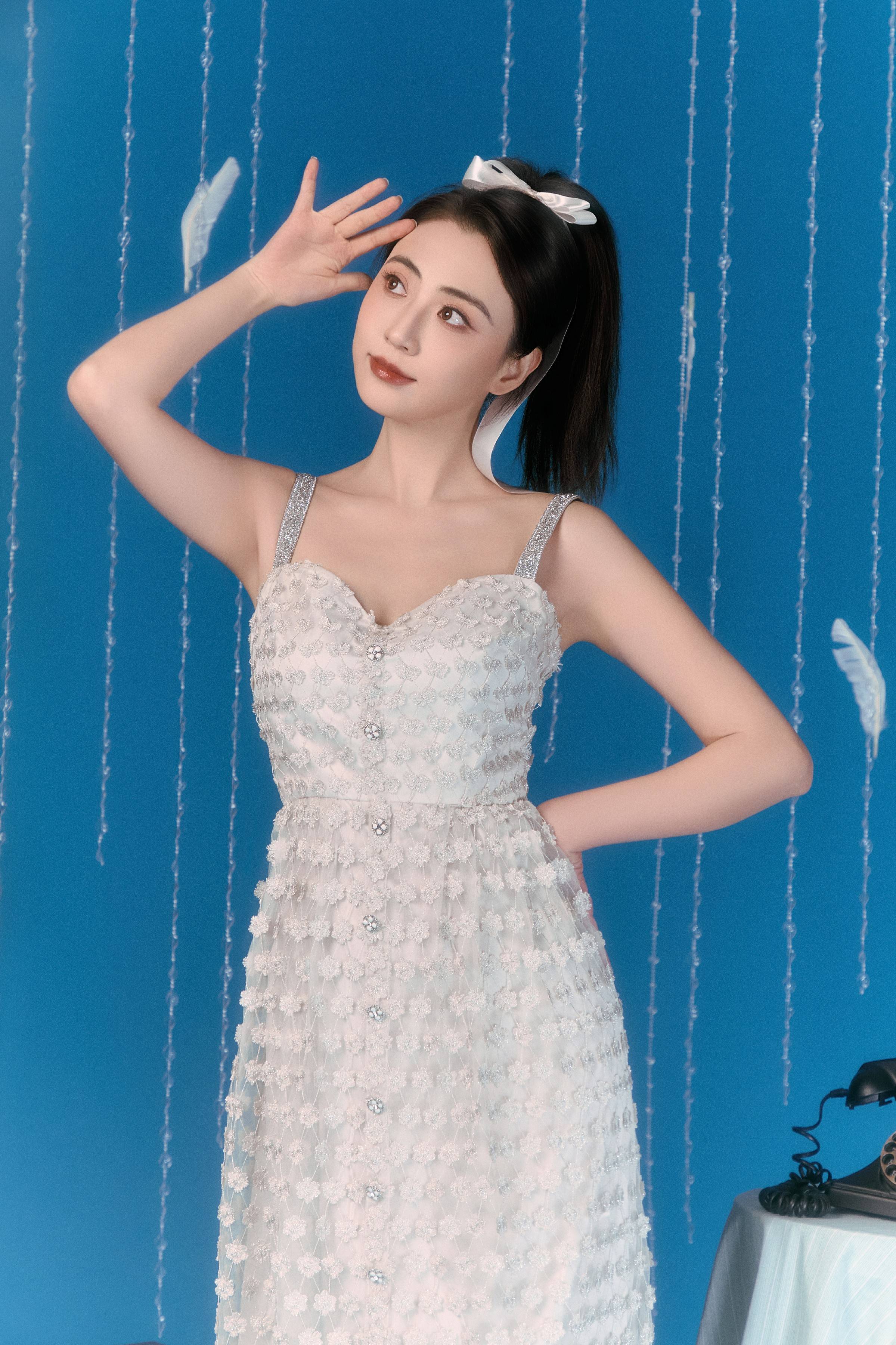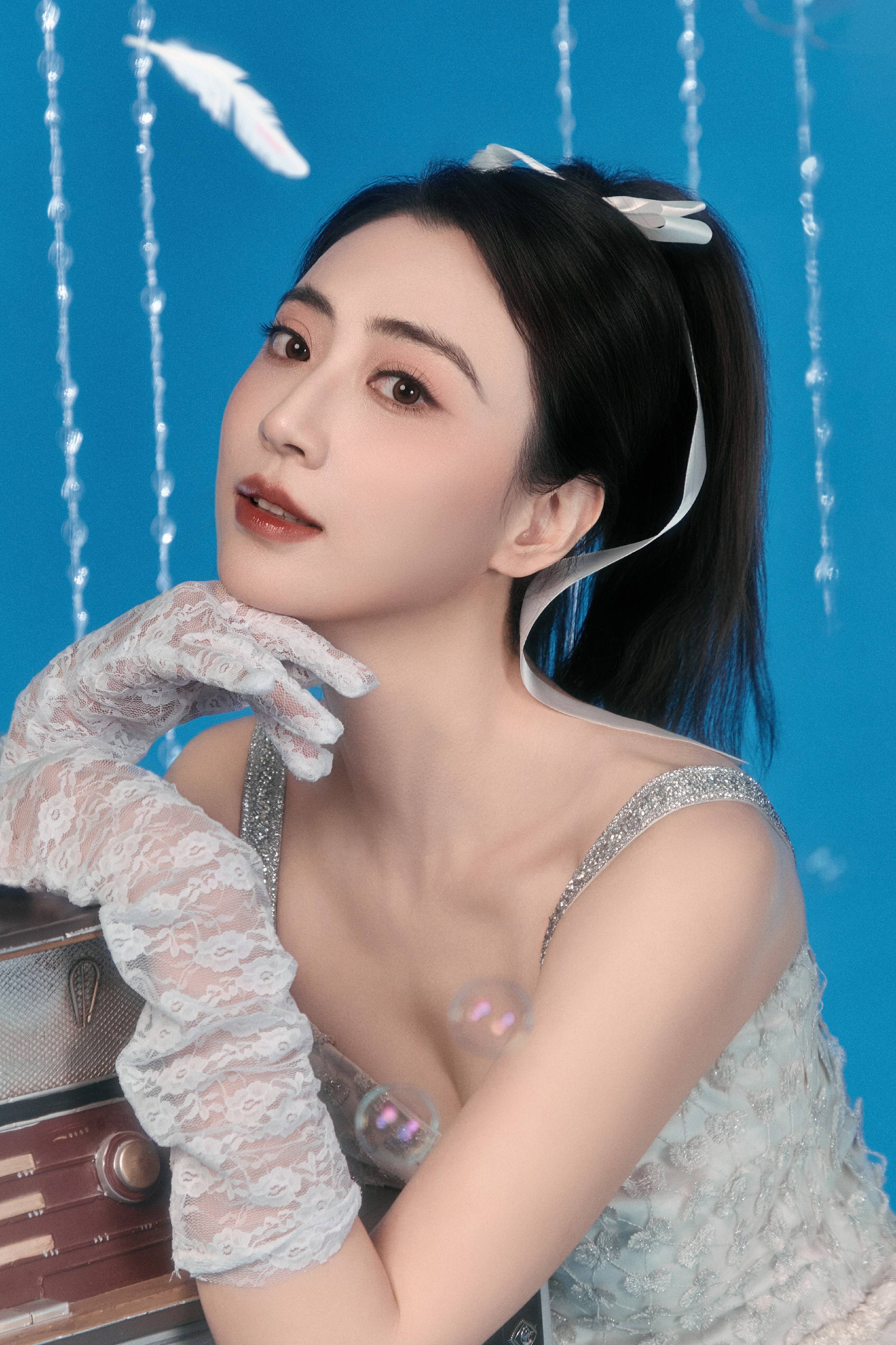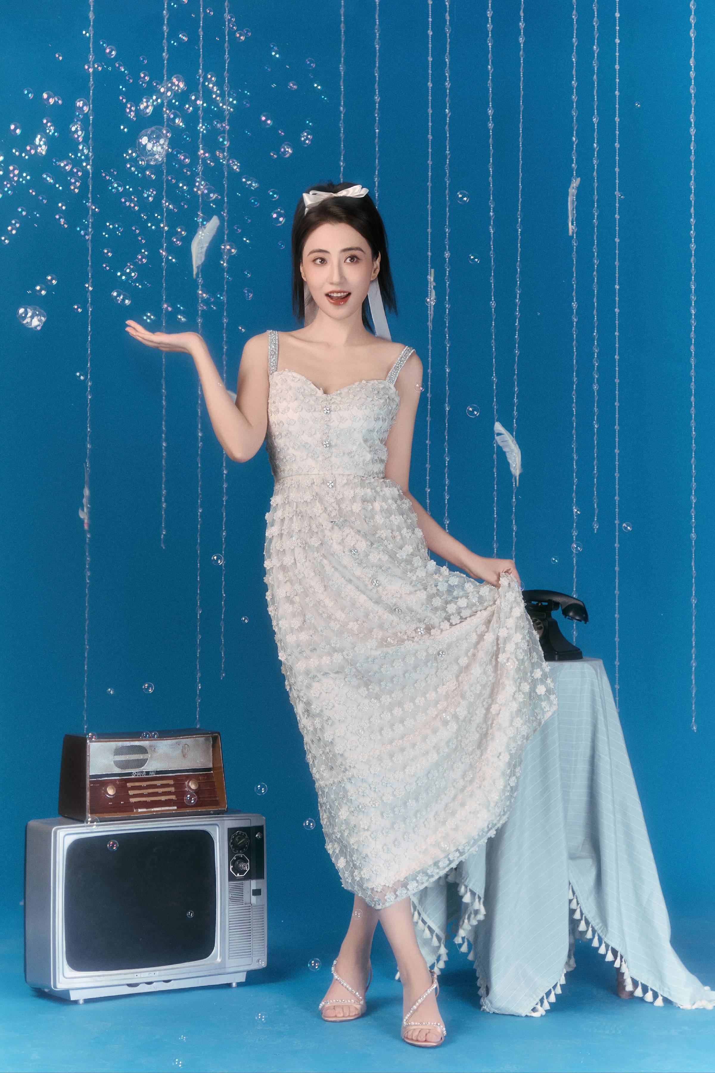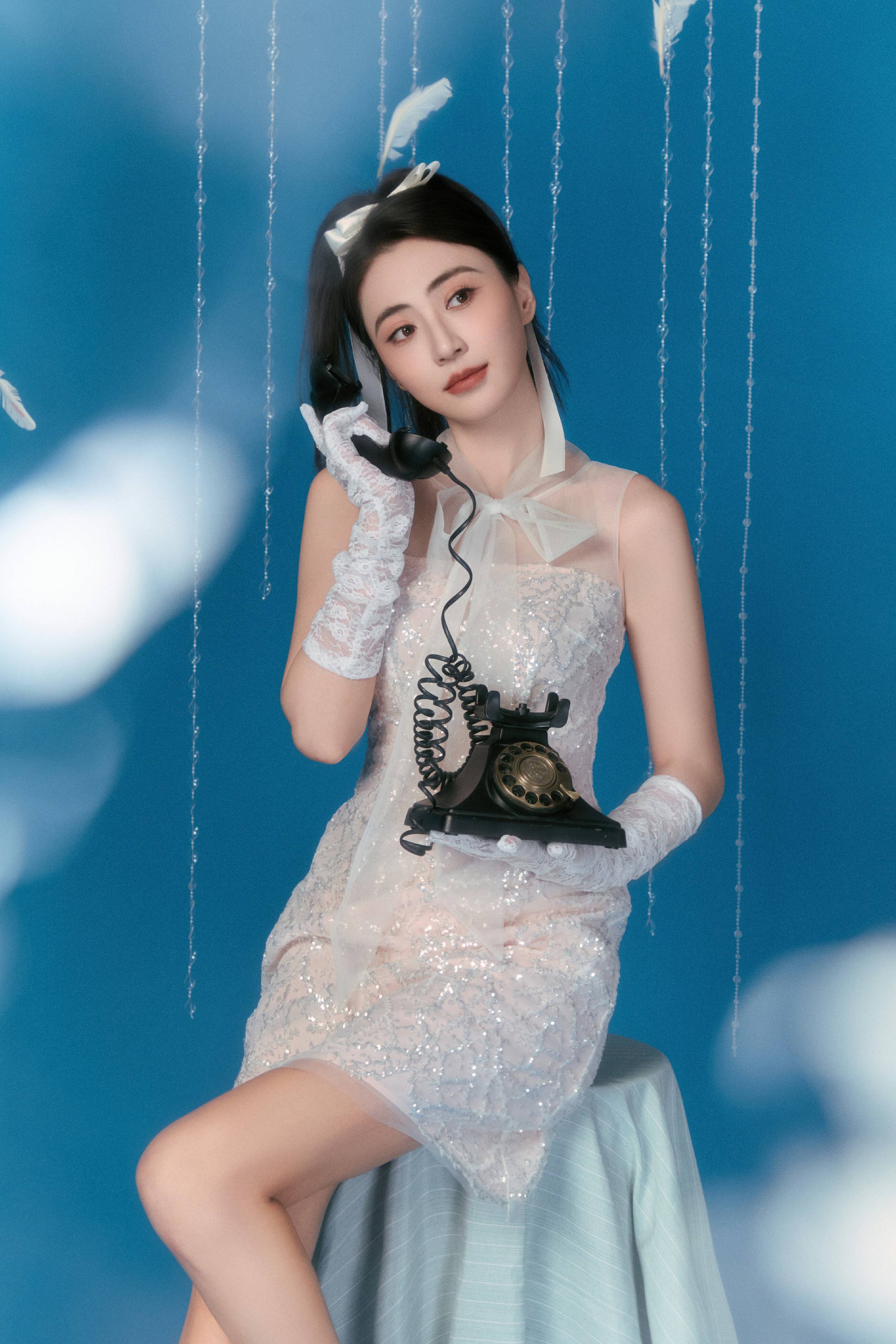 这组写真以高饱和度的克莱因蓝为背景,搭配复古收音机、老式电视机等道具,构建出一个怀旧氛围的梦境空间。镜头捕捉的不只是造型的精致,更是一种松弛自在的情绪表达。没有紧绷的姿态,只有松弛与自在,仿佛她正从旧时光里醒来,带着不被世俗惊扰的淡然。
