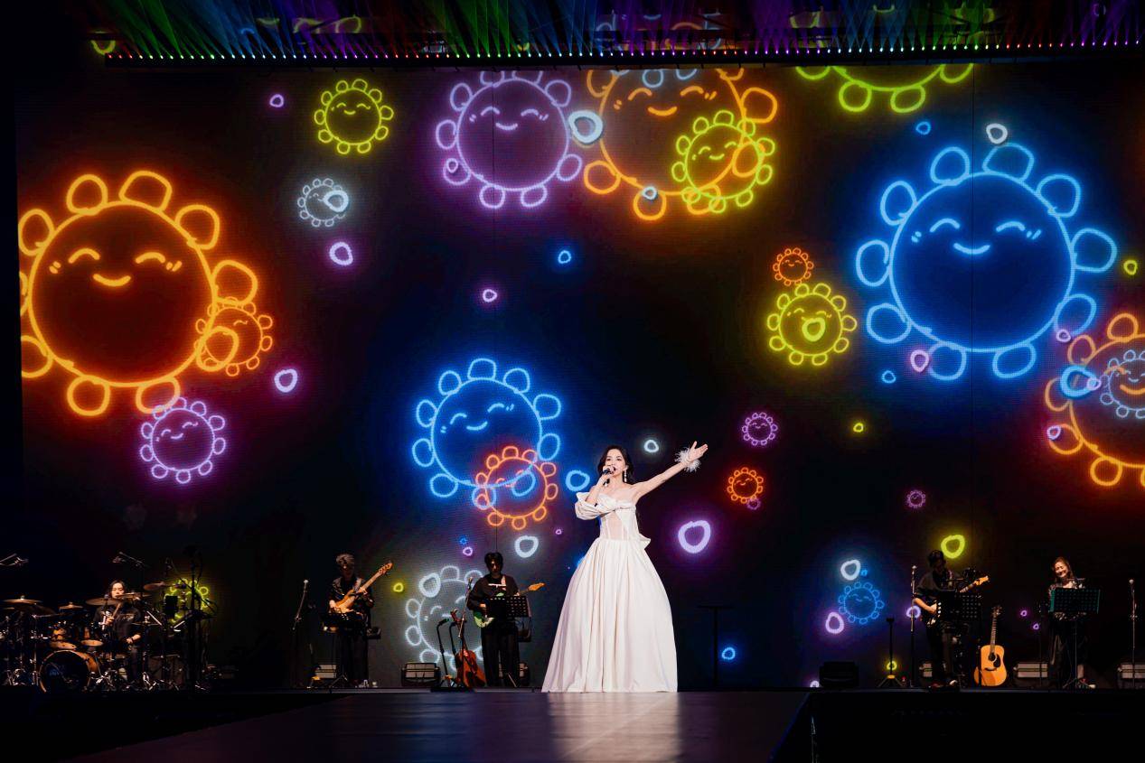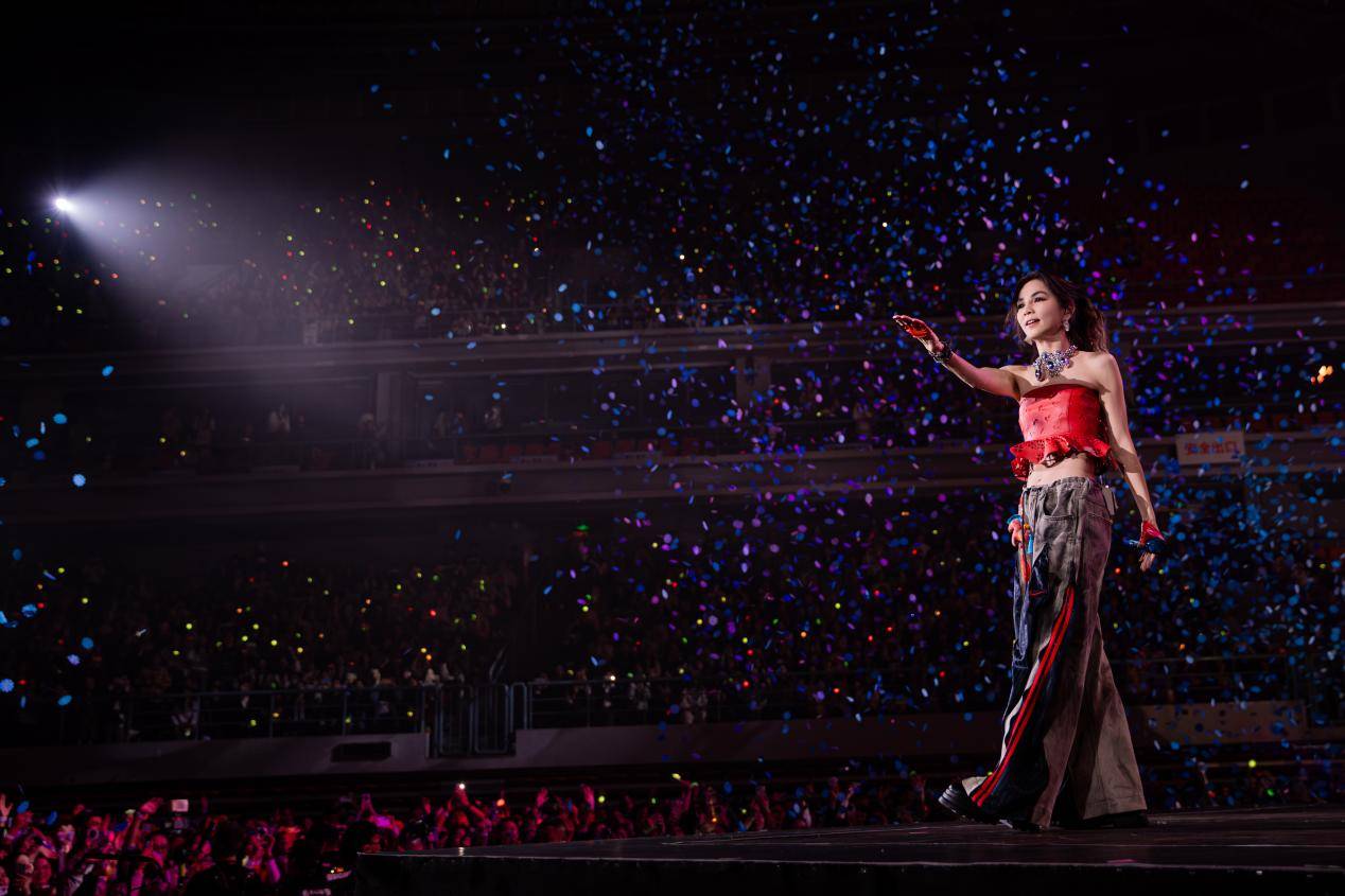 在服装造型上,此次南宁站 Ella 的穿搭同样精心设计、亮点十足,安可环节接连换上红色抹胸、蓝色牛仔吊带两套全新定制造型,红色款明艳大气,蓝色款清爽率性,两款造型各有风格,完美契合舞台超强气场。更值得一提的是,南宁站还迎来巡演新惊喜,现场漫天飘起 Ella 手写字定制的蓝色小太阳和金句彩带,每一片小太阳都印着她的专属笔迹,这份为歌迷量身打造的心意,让舞台视觉效果拉满,引得歌迷争相收藏,将现场的热烈与感动延续至演出之后。