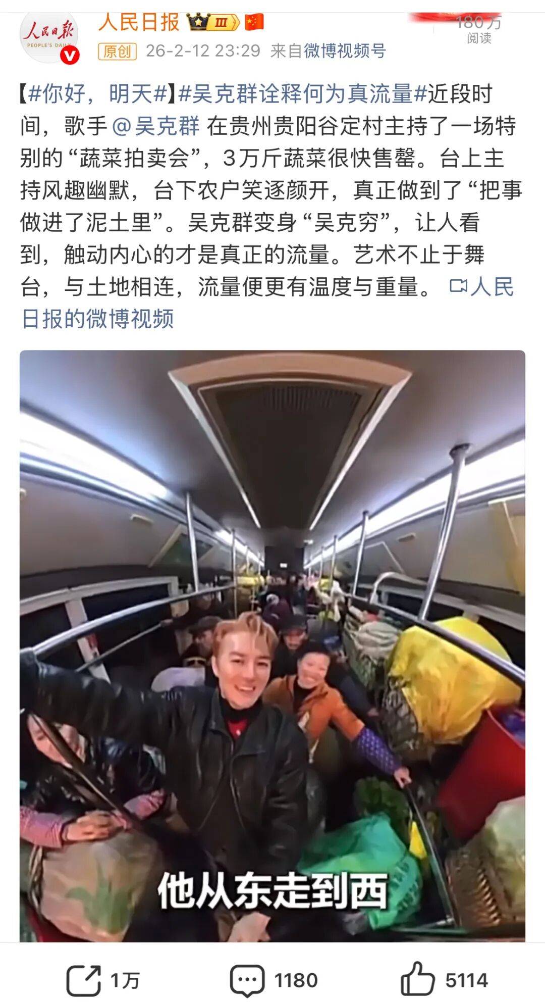紧接着人民日报微博直接点名,“吴克群诠释何为真流量”。“艺术不止于舞台,与土地相连,流量便更有温度与重量”。